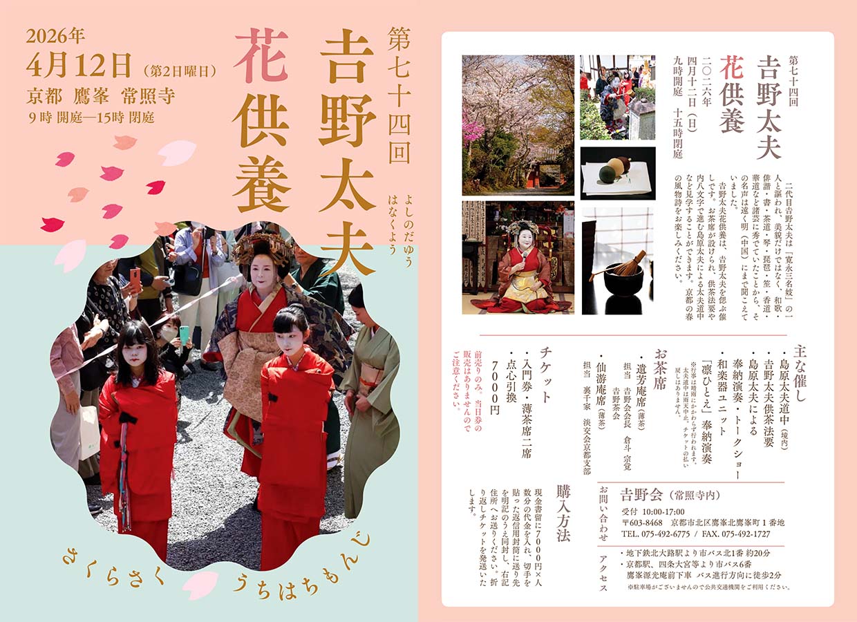 吉野太夫花供養は、洛北常照寺で行われる2代目吉野太夫を偲ぶ催しです。